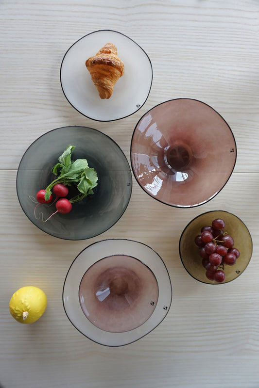 それぞれ、独自の透明な透き通るガラス工芸の色や素材と質感、表情が食卓や空間に馴染み、一層日々の暮らしに色どりを与えてくれます。カラーやサイズ、デザインも様々。日常使いからちょっとしたおもてなしにもお使いいただけます。大切な方へのギフトにも喜ばれるプロダクトです。