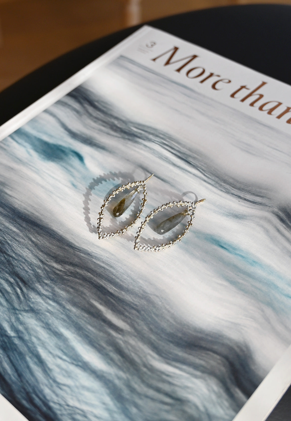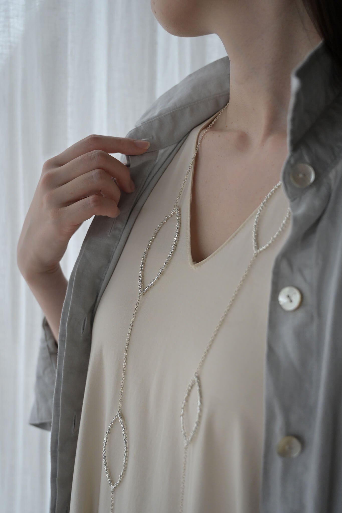 Daniela のシグニチャーであるDropage(円形)がどこまでも連続するイメージ。琥珀の中の内包物のように、自然界で何かをナチュラルに内包する形をイメージするコレクション。