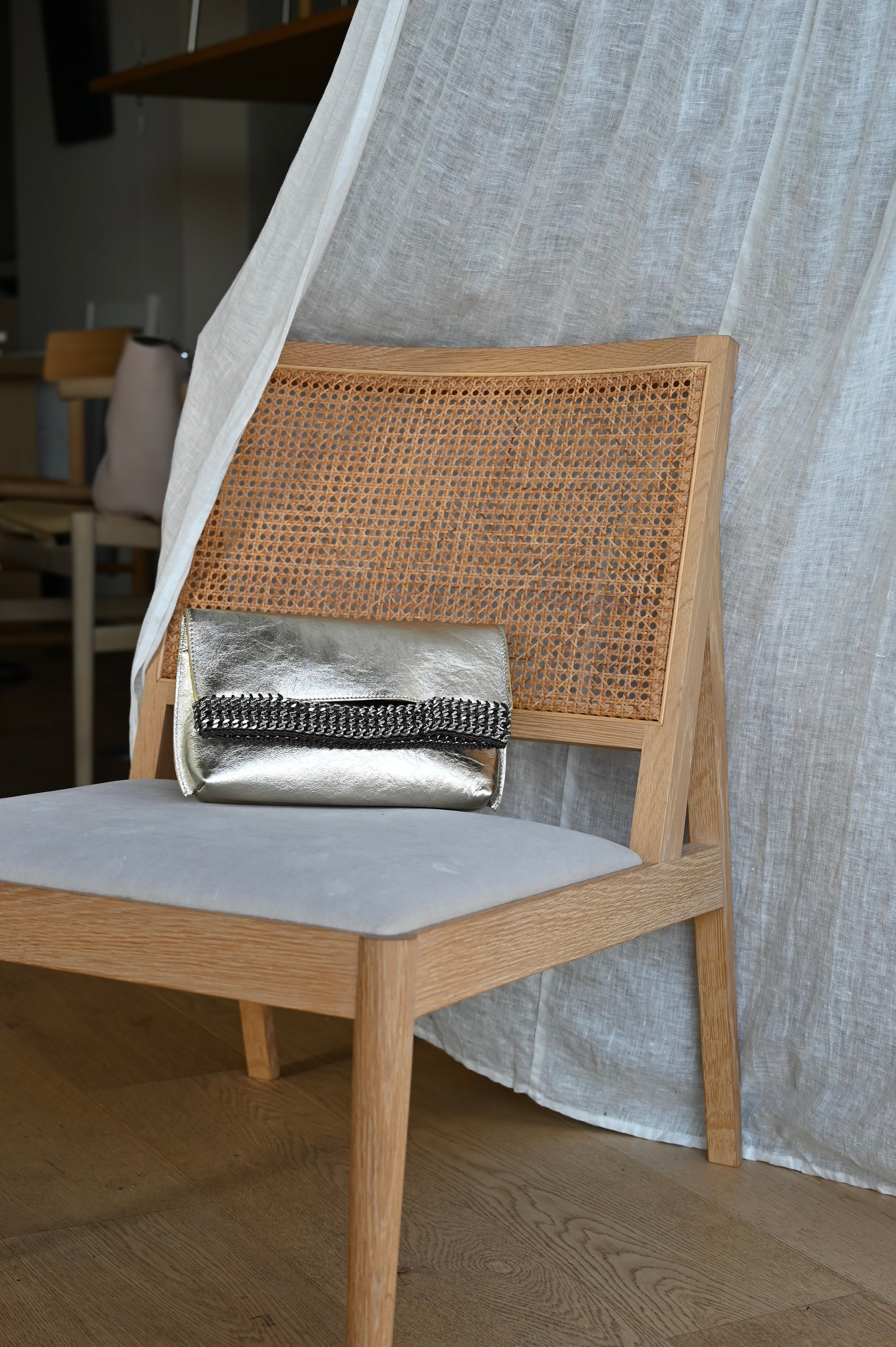 一見チェーンが重く見えますが、持ってみると非常に軽く持ちやすくなっています。マチがしっかりと取ってあるので、荷物もたっぷりと収まります。