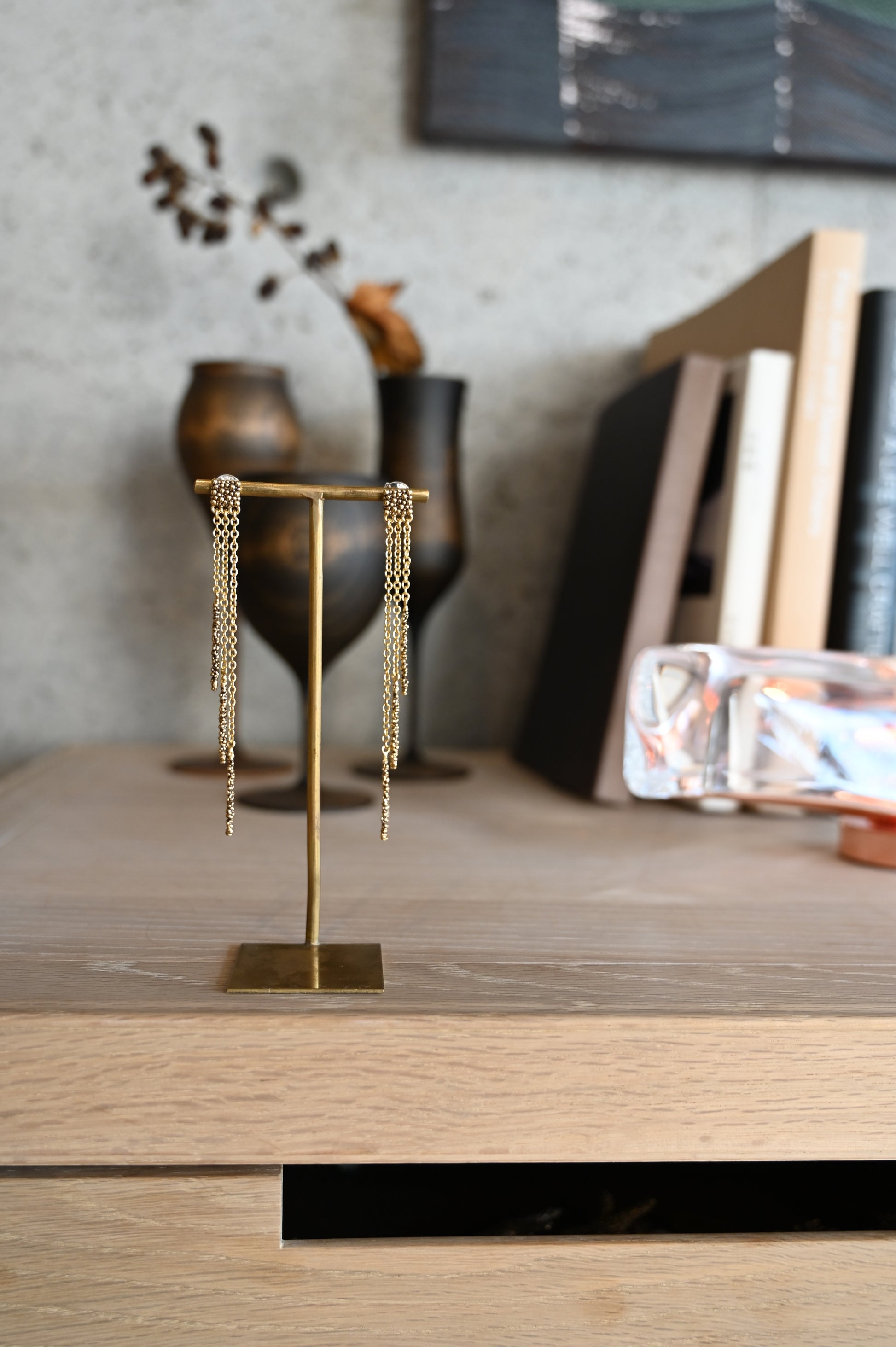 動きのあるロングピアス、シンプルなデザインだが、インパクトは大きく、