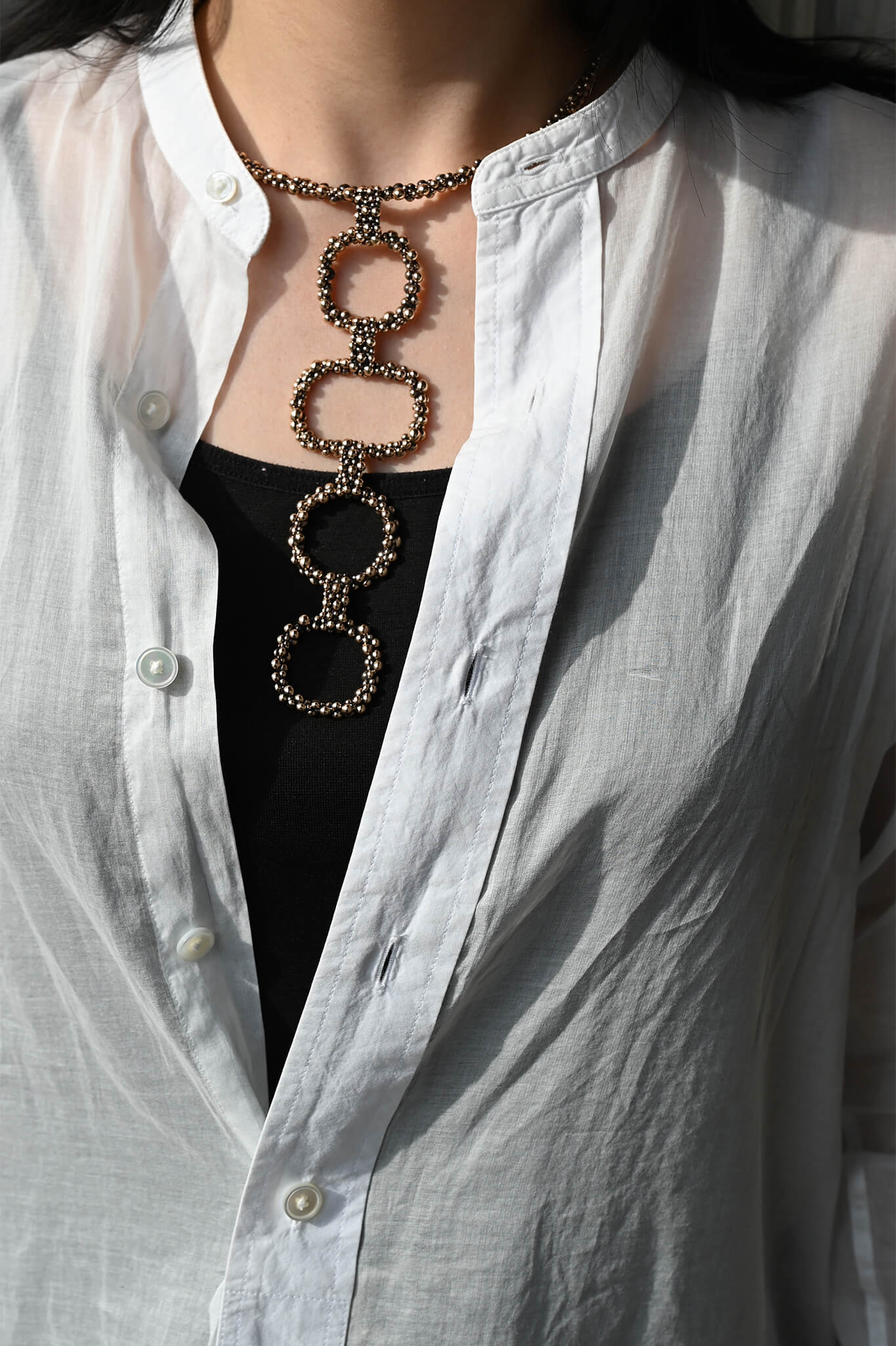 天然石とブロンズやシルバーを彫刻のように組み立てるダニエラのジュエリーは、これまでのジュエリーの常識とはかけ離れ、女性が持つ美しさの可能性を際限まで広げてくれる究極のジュエリー。イタリア国内だけでなく、フランスをはじめ、ヨーロッパでも話題のジュエラーです。