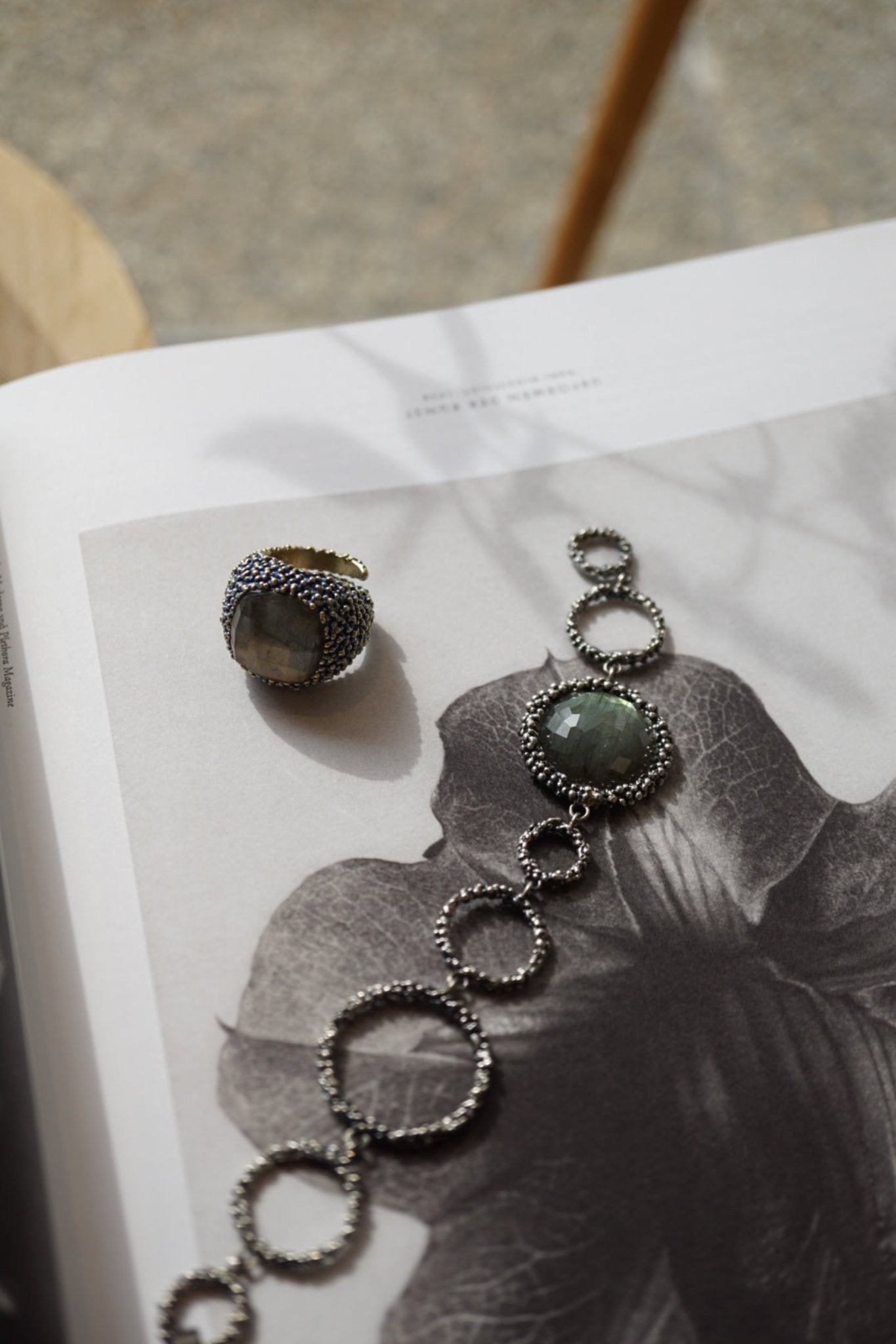 ダニエラのコレクションは、コレクション毎に発表されるメタルの色と美しい天然石のコーディネイトで完成されます。