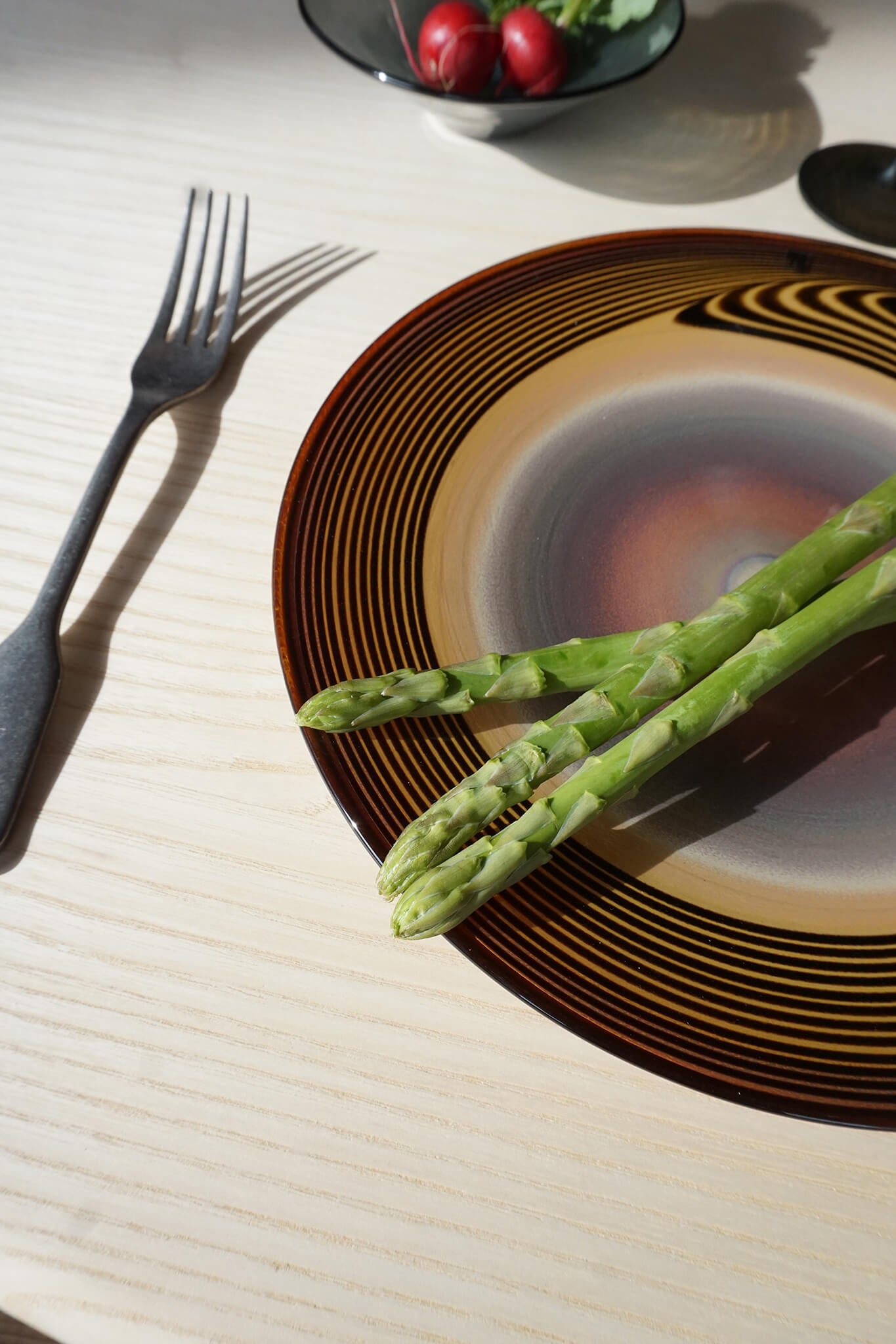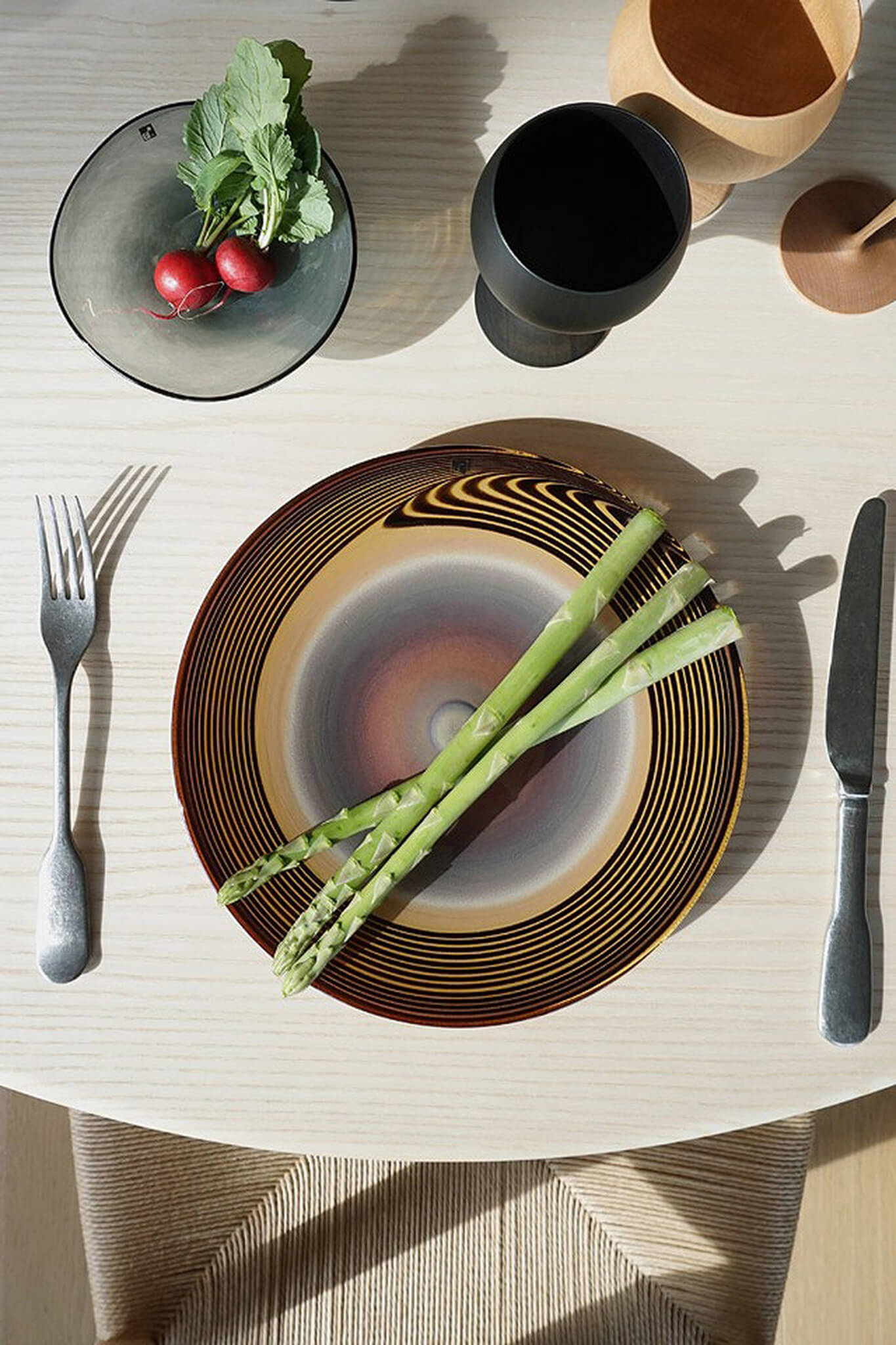 材料が回転しながら吹き上げられていく過程は、あたかも音のようなモノが作品の中心から外側へ響いていくよう。音の痕跡のような表情がお料理をより一層引き立ててくれます。