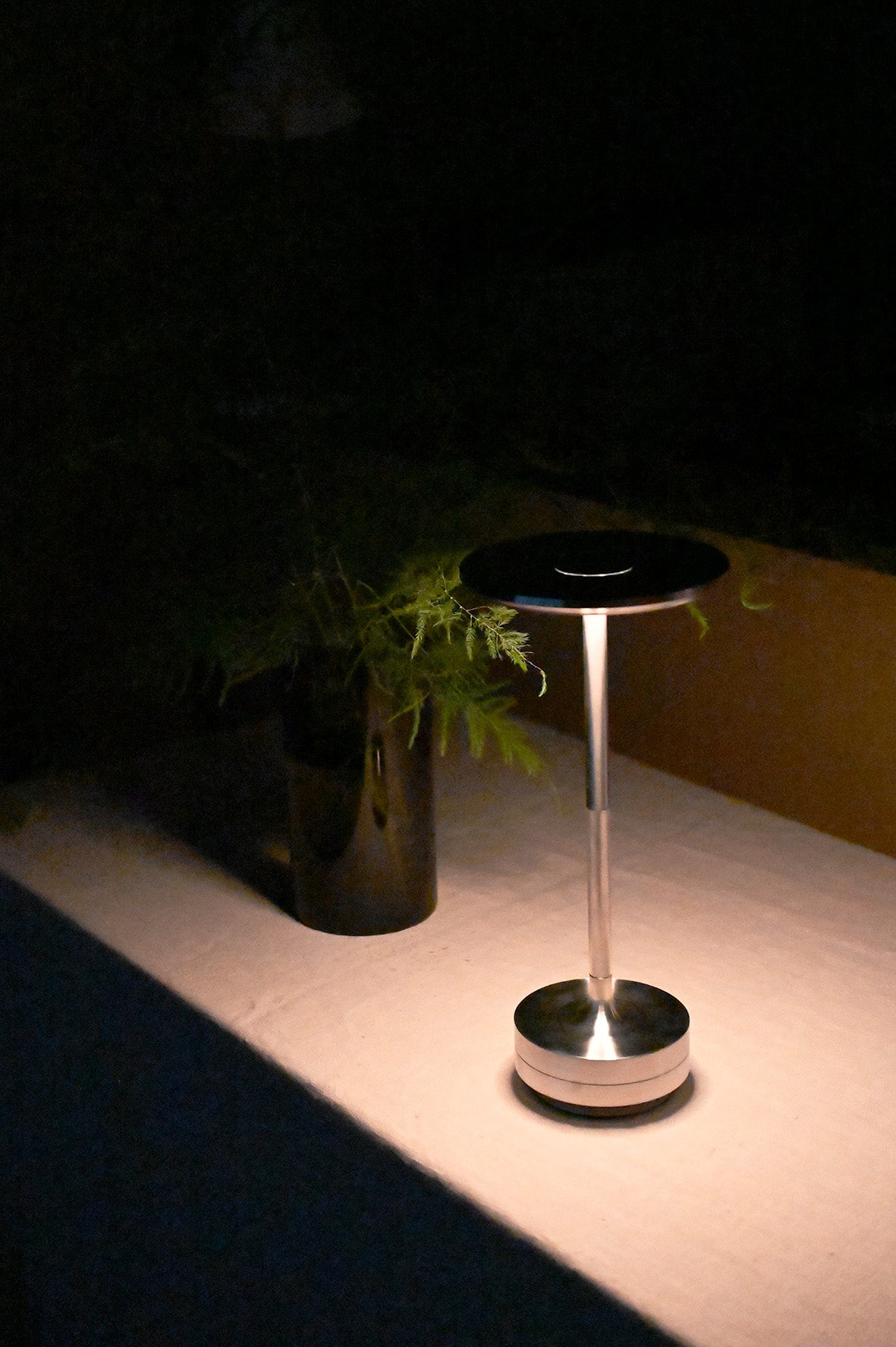 金属のかたまりから削り出した端正な姿、手に馴染む硬質なテクスチャー。真っすぐに立ち上がる姿から、やわらかな光を照らすコードレス・テーブルランプ。温かな暗みで満たされて、夜が特別な時間に。